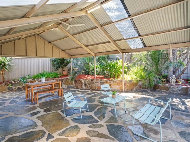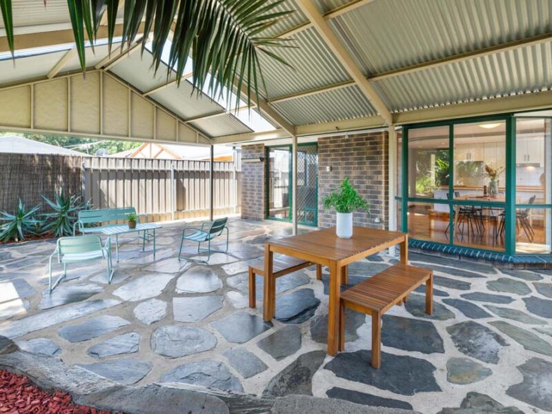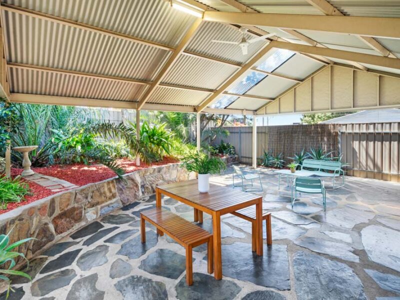 As you walk through the sliding doors from the living room, you will find a large outdoor entertainment area with a flurry of green in the garden.