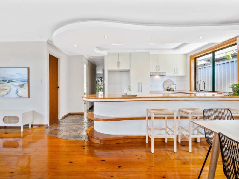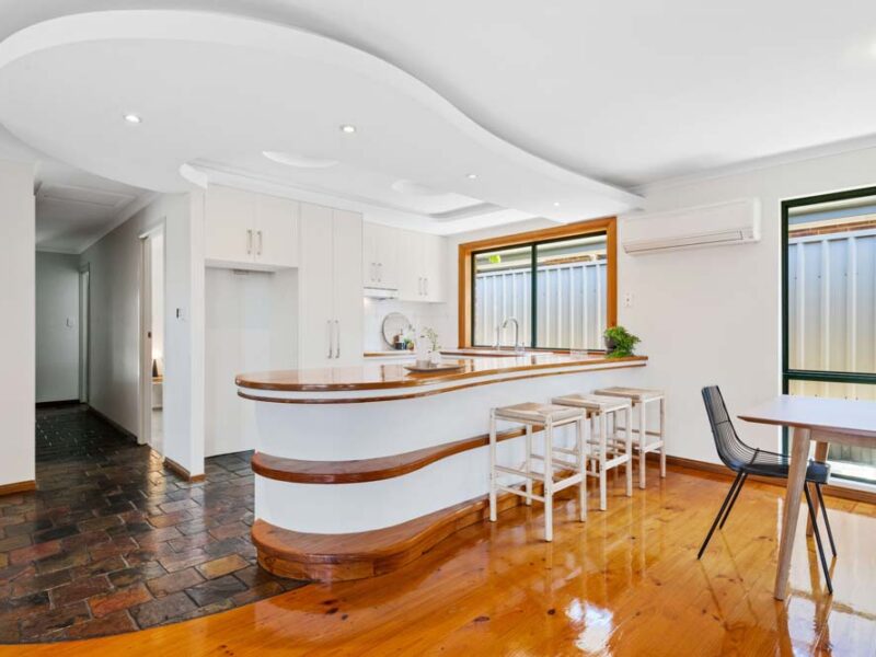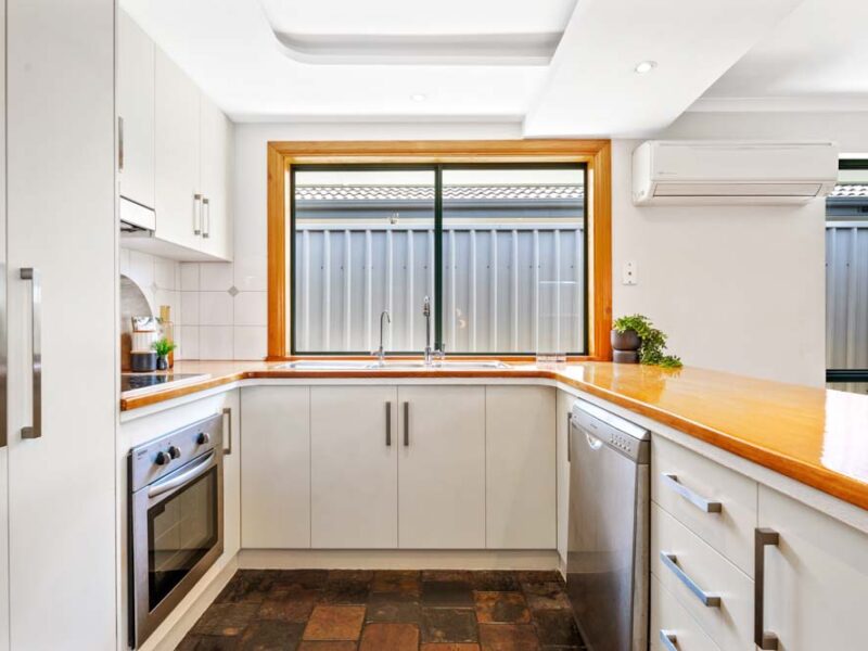 The exceptional slate-floored kitchen is fitted out with ample cupboard storage space, stainless steel appliances including the electric stove, range hood and dishwasher. The timber breakfast bench provides clever serving options for entertaining guests or feeding the family.