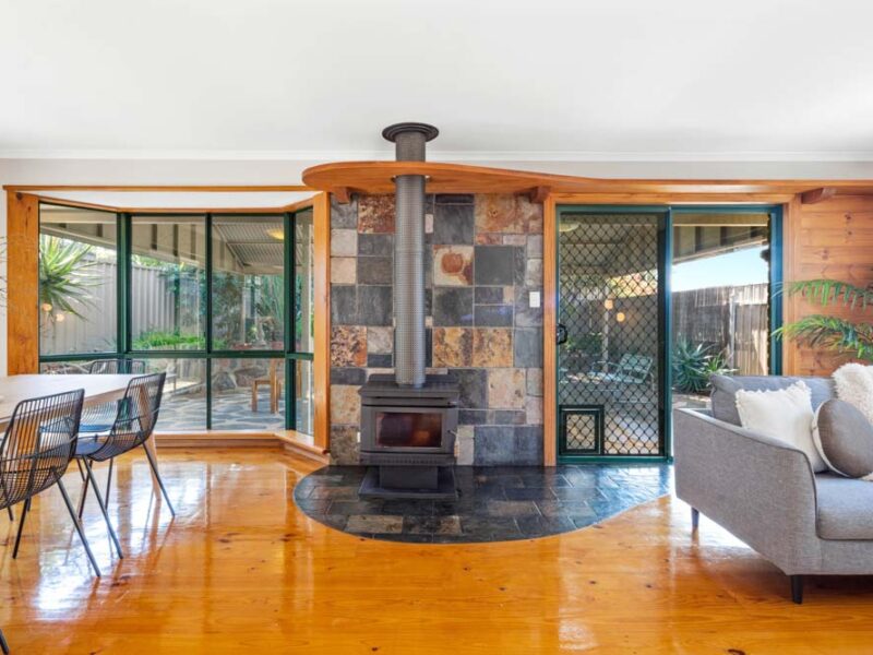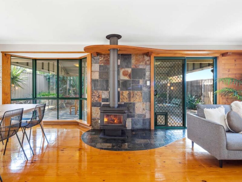 The open plan dining and living areas glisten from the polished timber floors and natural light that fills the space. The focal point of the living area is a deluxe combustion heater for ambient winters. The evaporative ducted cooling vents are throughout the home to cater to the warmer months.