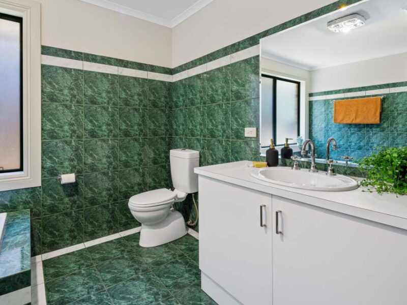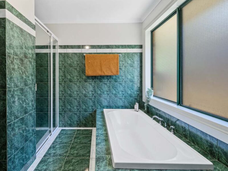The bathroom boasts emerald coloured tiles near to the ceiling, with well appointed chrome tapware in the bath, shower and vanity.